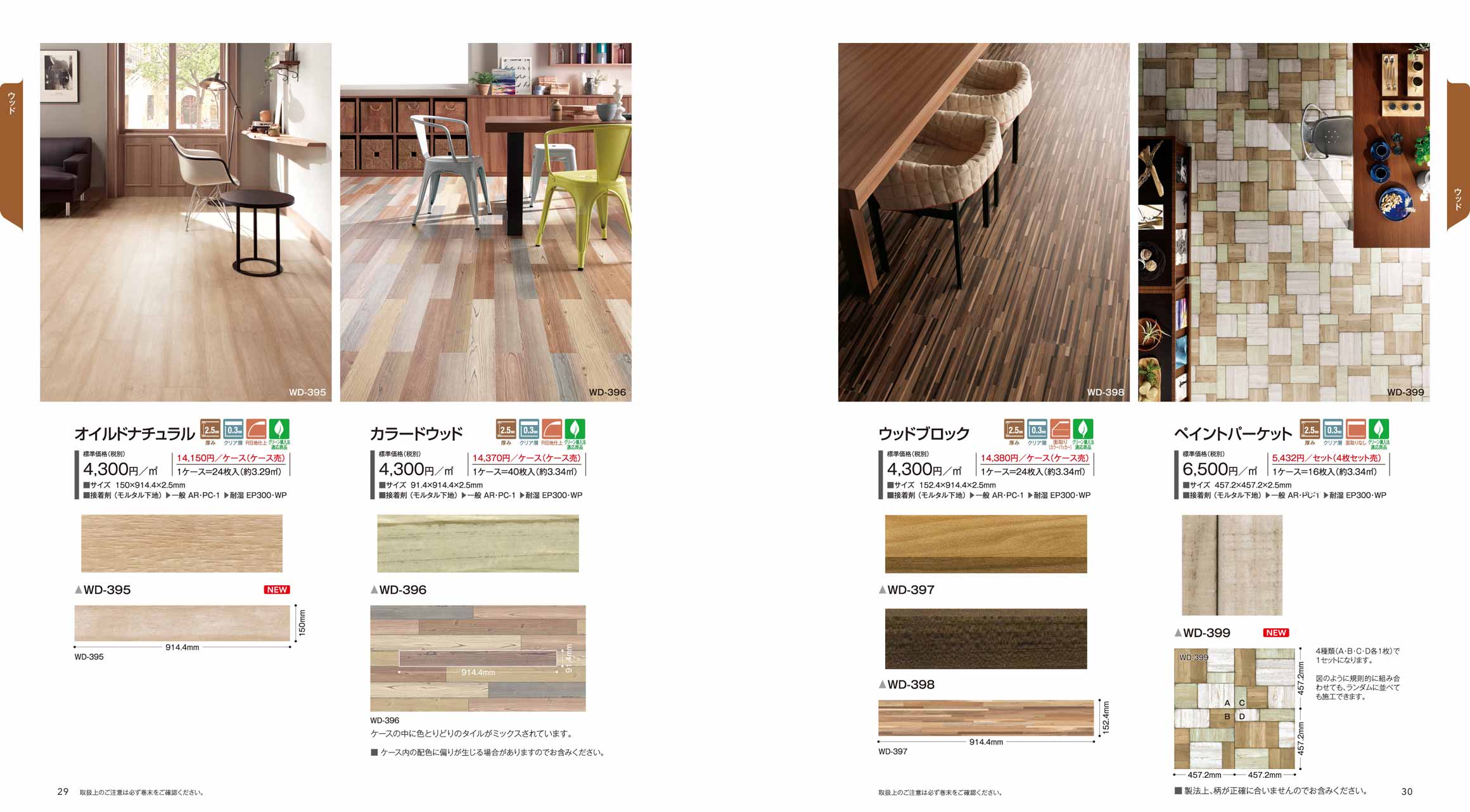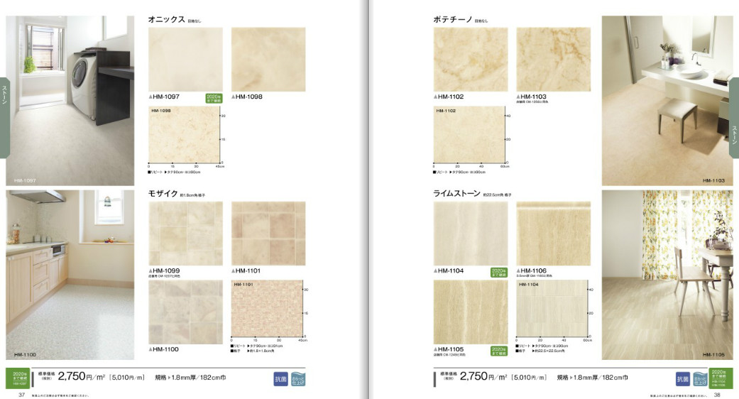 - 戸建てやアパート、マンションから店舗、各種施設の幅広い用途に対応する塩ビ床シート「クッションフロア」を1冊に収録。消臭・防滑性を備えた「ペット快適専科」や「遮音フロア」、転倒時の衝撃を緩和する「3.5mmフロア」など320点を揃え、床材選びの幅を広げます。